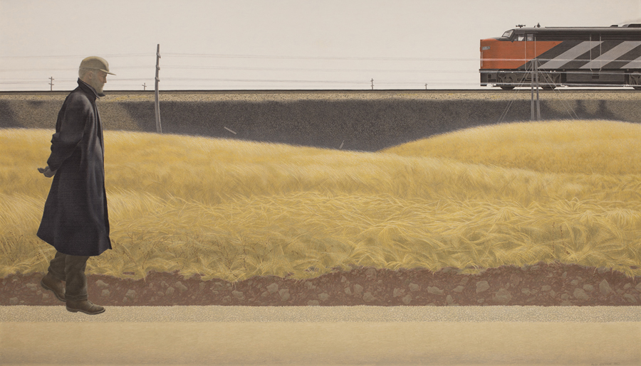 La nuova testata ha invece come immagine un particolare di un quadro del pittore canadese Alex Colville (David Alexander Colville, 1920-2013), Ocean Limited (1962), presente qui anche come immagine di apertura del post. Un'opera dall'effetto straniante che a me piace pensare proprio come un'indagine sul mistero del tempo, rappresentato dal pittore sotto due aspetti diversi corrispondenti ai due piani della tela: al di sotto della linea dell'orizzonte il movimento è chiaramente suggerito: dal piede dell'uomo sollevato da terra e dal grano percorso da una folata di vento; al di sopra, invece, tutto appare come congelato in un istante atemporale. Con un risultato quasi metafisico.
